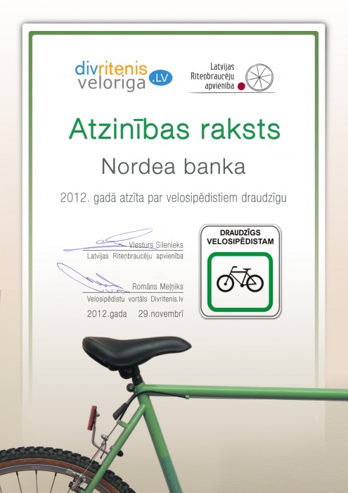 “Draudzīgs velosipēdistam” piešķirts 2012. gadā par korporatīvo velosipēdu izmantošanu.